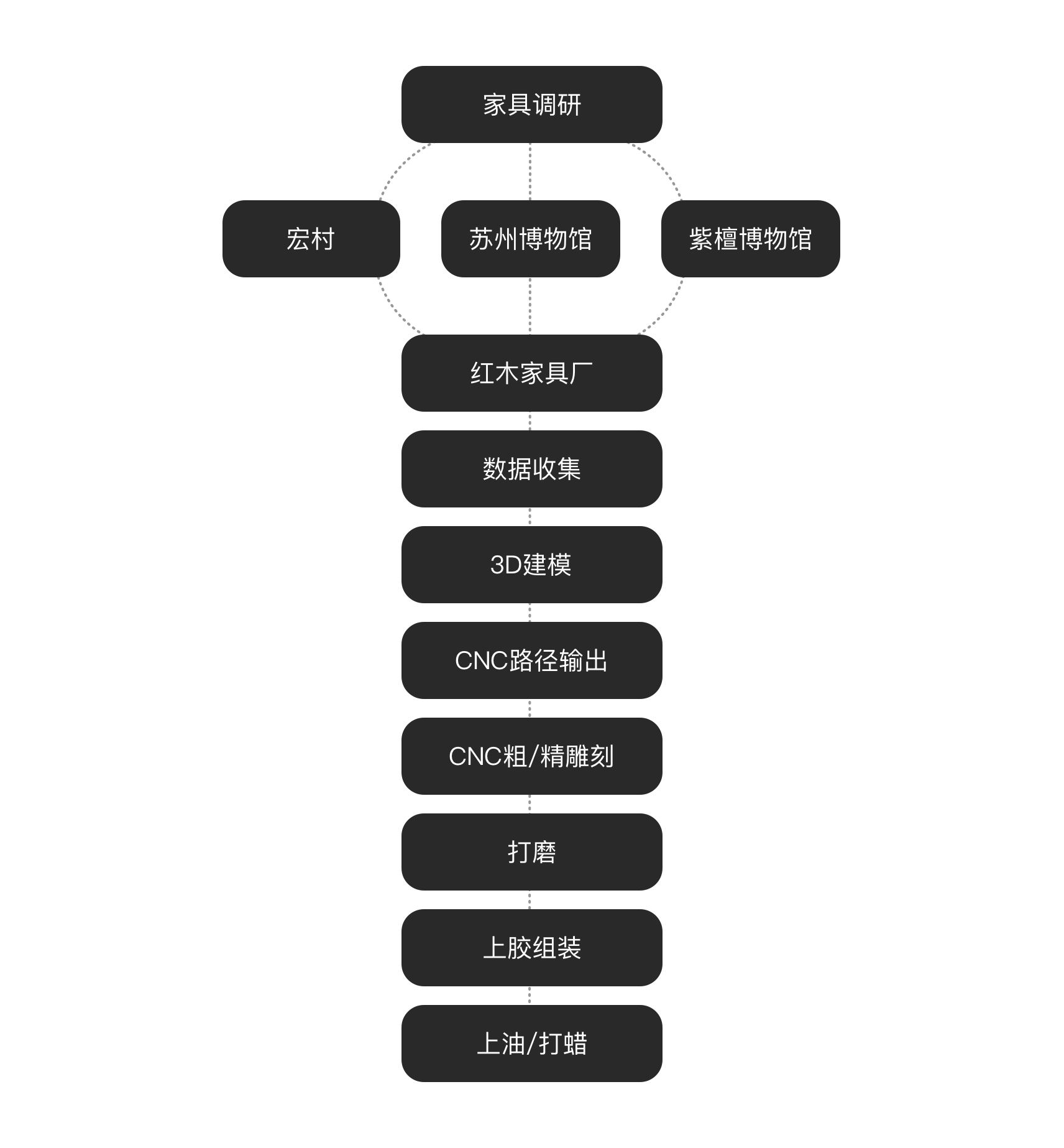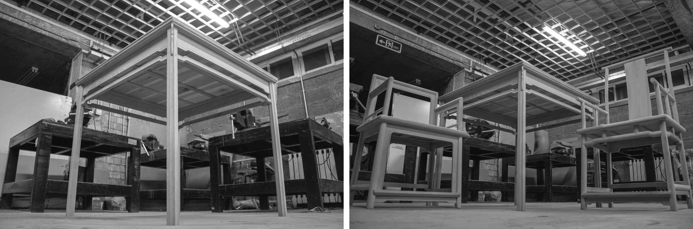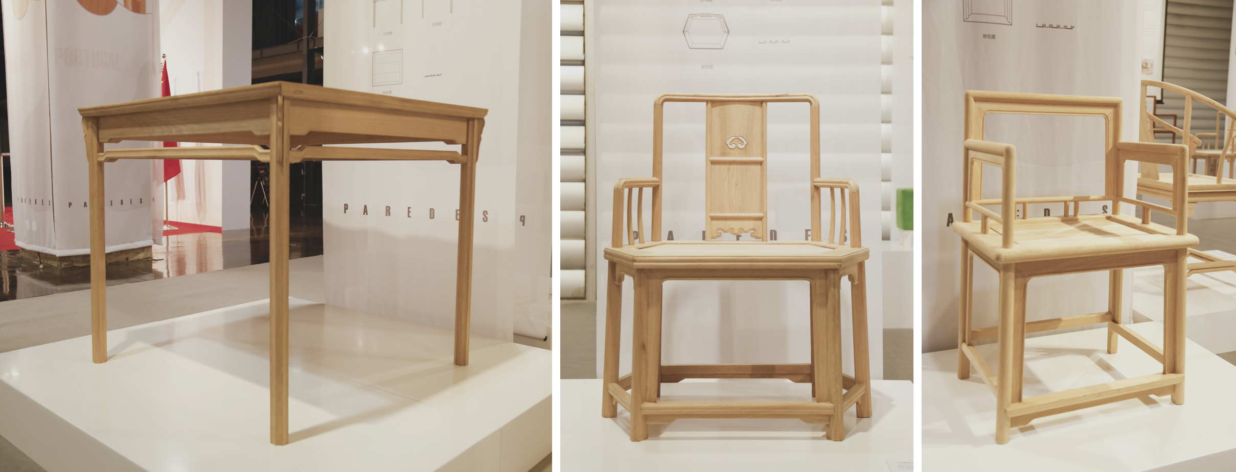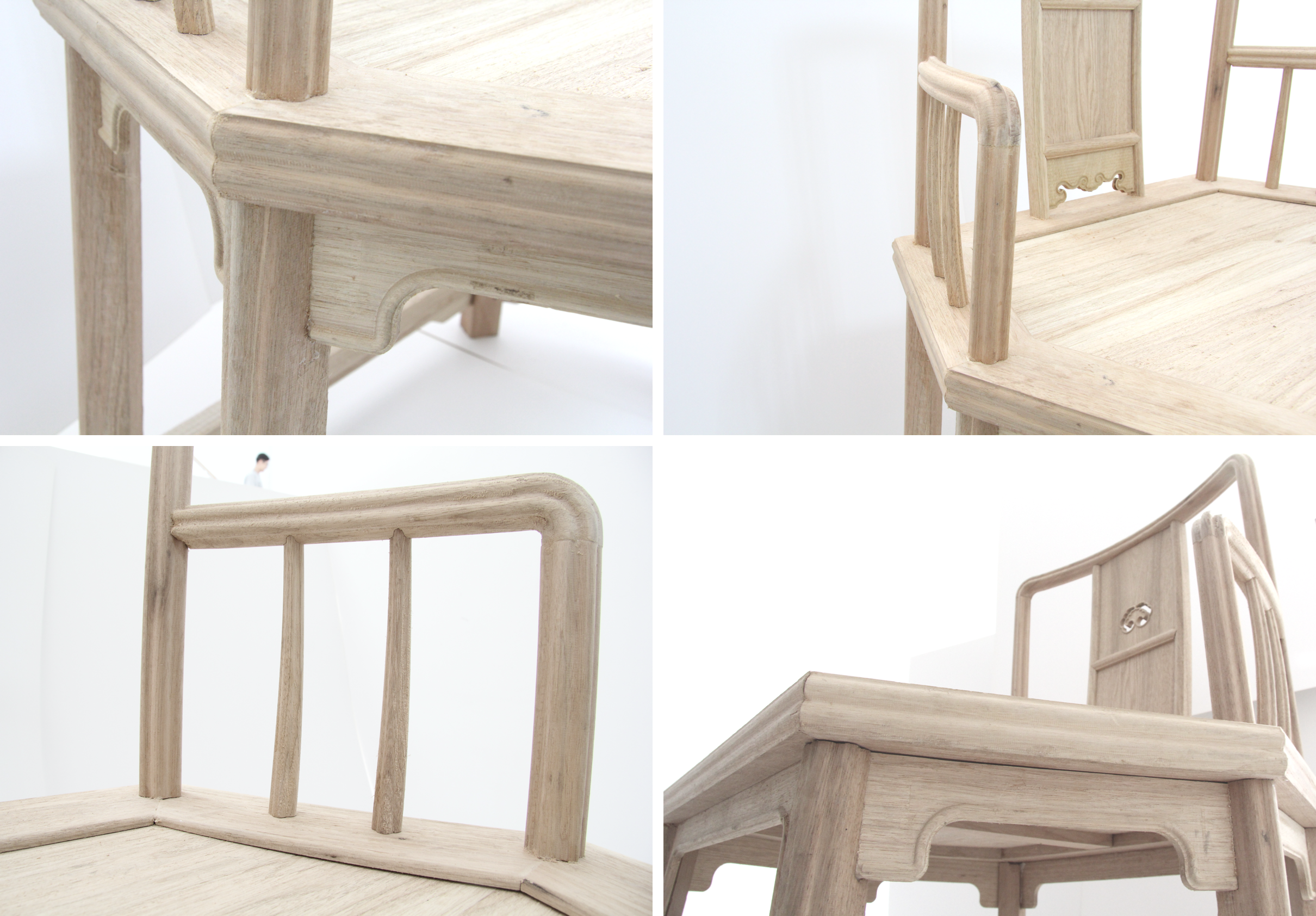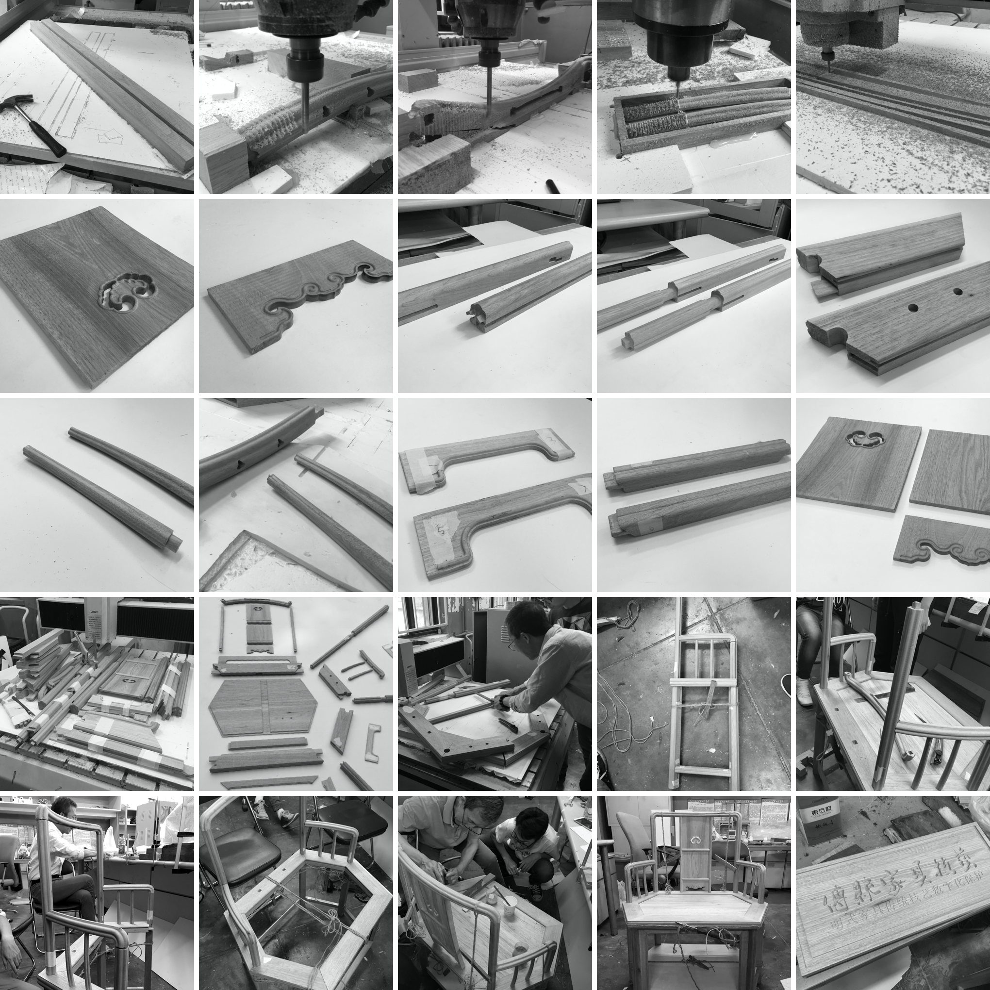 在项目初期,我们深入到南方一些拥有明式家具的博物馆与村落中进行实地的家具调研与数据采集,然后带着数据向专业生产红木家具的工厂 老师傅请教榫卯结构与加工工艺方法,利用3D Scanner对一些关键节点进行扫描与数据收集,最后结合现代化的数字建模技术与数控加工 工艺,对家具进行了一比一的复原设计