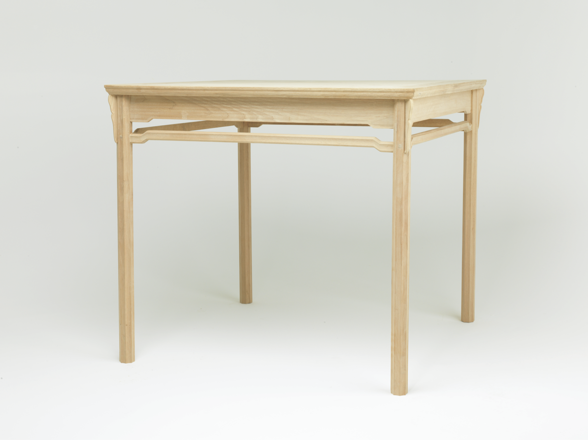 “一腿三牙罗锅枨”是明式方桌中的一种常见形式。所谓“一腿三牙”是指四条腿中的任何一条都和三个牙子相交。三个牙子即两侧的两根长牙条和桌角的一块牙 头,所谓“罗锅枨”即安在长牙条下面的枨子,不过此桌虽属此式,四足直立,不用侧脚,此例权衡,花纹线脚也与一般常见的不同,其风格也别具一格。